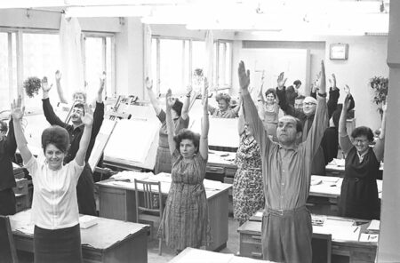Pendant la perestroïka, la gymnastique est devenue une formalité. Elle a parfois été remplacée par le tennis de table à l’heure du déjeuner. Des blagues à ce sujet ont même été publiées dans le magazine satirique Krokodil. Elle a progressivement été abandonnée et a cessé avec l’effondrement de l’URSS.