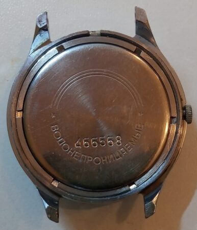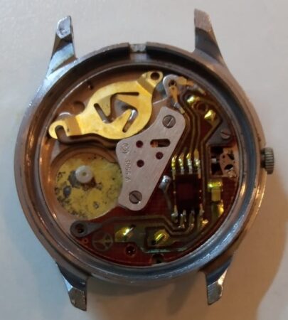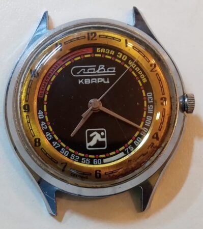 Mentions sur le cadran : кварц (au-dessus de l’axe des aiguilles), база 30 чаров (« base de 30 battements ») en haut à droite, sur le pourtour du pulsomètre, et cделано в cccp à six heures.