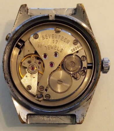 Mentions sur le calibre : dernier logo Poljot (couronne) sur la platine, SEVETEEN 17 JEWELS, SU, et 2628H sur le pont.