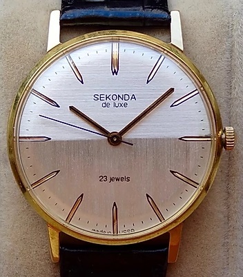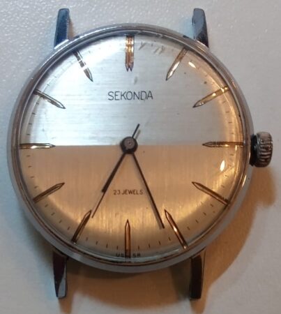Probablement fabriquée par la Fabrique de Montres FM de Minsk avec un mécanisme de la 1FMM, une combinaison assez classique