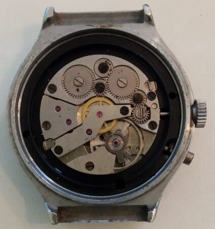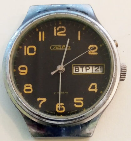 Cet exemplaire (en panne) pose quelques questions. Le cadran type 791 apparaît au catalogue Slava de 1983 mais avec un classique boîtier type 301. L’absence de marquage du mécanisme indique une production de la fin des années ’80 mais ce qui est intriguant est un boîtier qui n’apparaît sur aucun catalogue Slava.