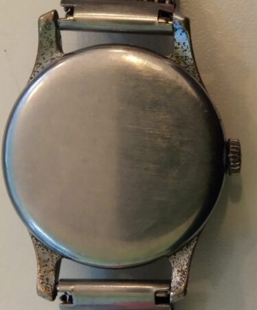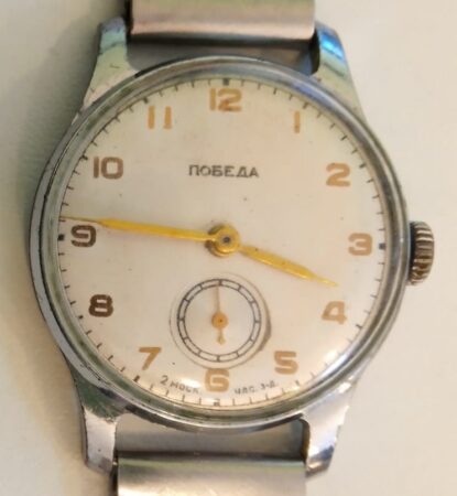 Mentions sur le calibre : 15 камней , 1-57 (1er trimestre 1957), logo de la fabrique (Ч2З dans un demi rouage), POBEDA et trois étoiles sur le rochet, côtes de Genève.