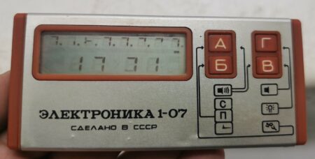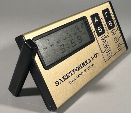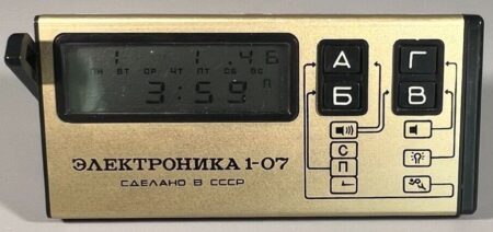 Réveil digital de la marque Elektronika 1-07 de la fabrique Pulsar de Moscou.Largeur: 10.5 cmHauteur: 4,5 cmÉpaisseur: 1,7 cmAnnée de production: 1987