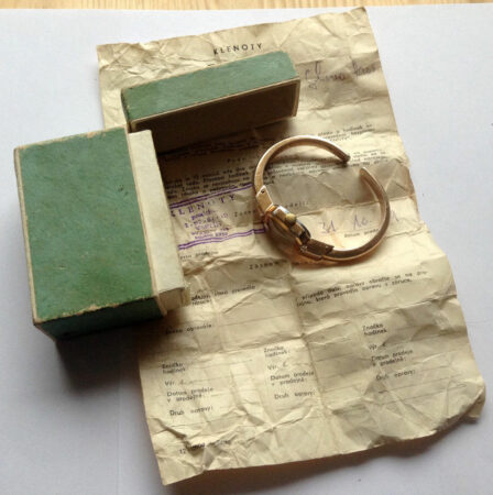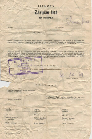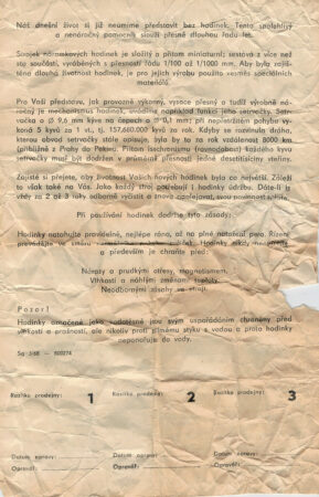 Cet exemplaire a été vendu à Svarov (Tchécoslovaquie). Le bulletin de garantie a été délivré le 31 octobre 1969. A remarqué qu’il a été vendu dans une boîte Slava conçue pour ce modèle de montre.
