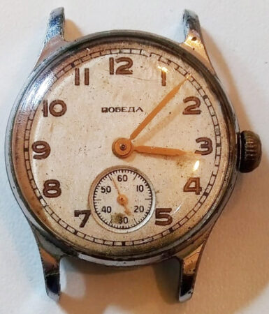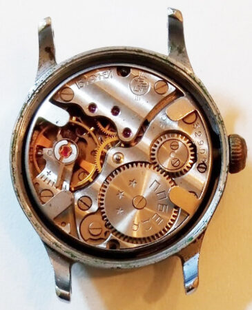 Mentions sur le calibre : n° de série et 1-56 (1er trimestre 1956), 15 камней et logo de la fabrique sur un autre, Победа et trois étoiles sur le rochet, côtes de Genève.