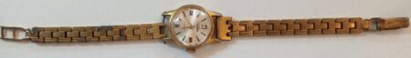Bracelet d’origine, doré, à fermeture papillon (il est sur la photo du catalogue), mais il manque une des deux attaches spéciales qui le relient au boîtier