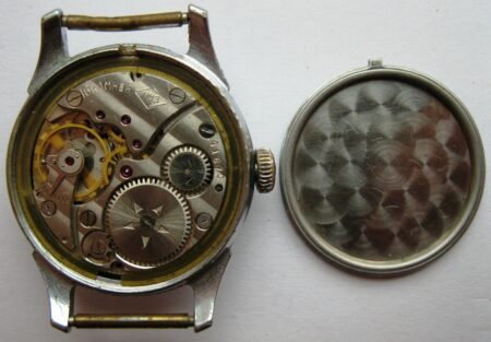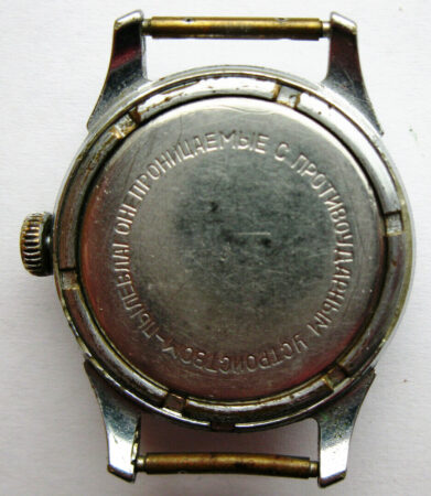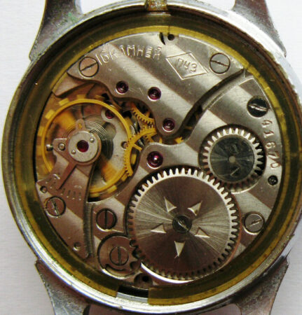 Mentions sur le calibre : logo de Petrodvorest (initiale dans un losance) et 16 камня (16 rubis) sur un pont, n° de série (41670) sur un autre, cinq triangle sur le rochet. Cotes de Genève.