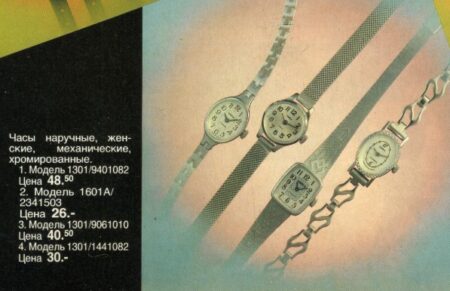 Au bulletin du commerce et de l’industrie (Вестник торговли и промышленности) – Catalogue des biens de consommation N°4 1991 – le boitier-bracelet à droite, l’ensemble cadran-aiguille à gauche: ces ensemble s’inter-échangeaient pour composer une large gamme de modèle.
