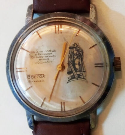 Mention sur le cadran: 20 лет / на день победы в Великой Отечественной войне / 1941-45ГГ et image de la statue du soldat soviétique libérateur du Mémorial de Trepkow