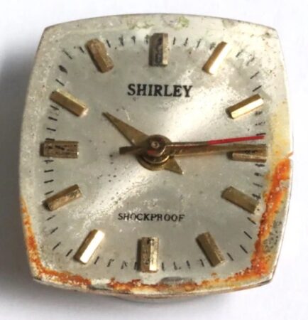 Cette épave est le seul exemplaire connu d’une Shirley (peut-être originaire de Hong-Kong) embarquant un mécanisme soviétique, en l’occurence un Zaria 1509B à 17 rubis et trotteuse centrale de la de la Fabrique de Montres de Penza