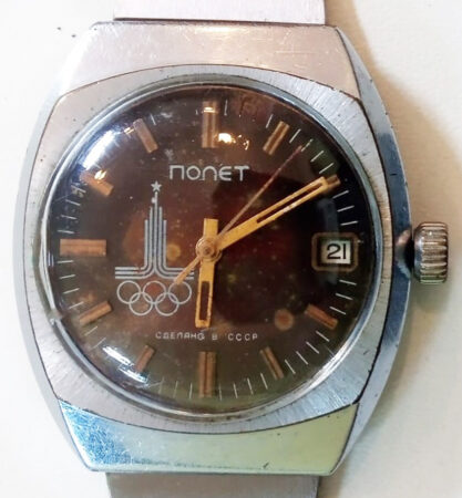 Montre-bracelet produite par la 1ère Fabrique de Montres de Moscou commémorant les Jeux olympiques de Moscou de 1980 avec le logo des jeux.