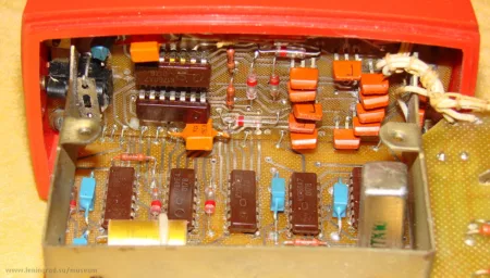 Il y a deux boutons de commande : le premier remet à zéro les heures et les minutes, et si on le maintient enfoncé, les minutes commenceront à augmenter d’une unité toutes les secondes. Le second bouton n’augmente que les valeurs des heures. L’appareil contient un certain nombre de microprocesseurs de la série 176.
