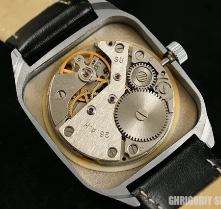 Mentions sur le calibre : 2614.H et SU (Soviet Union) sur le pont, logo raketa (raquette symbolisée) sur la platine.