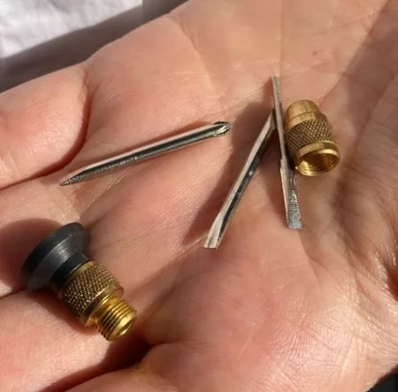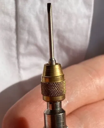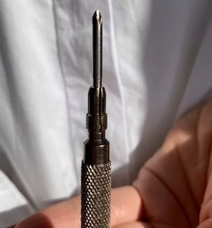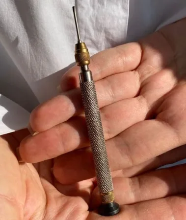Tournevis d’horloger en acier et laiton, il y a au total 6 têtes grâce à deux tiges rangées à l’intérieur du tournevis quand vous ne les utiliser pas.