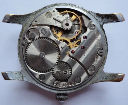 Mentions sur le calibre : 15 камней ЗИМ sur un pont, n° de série (07477) sur un autre, côtes de Genève