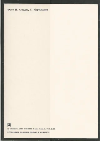 Photo de N. Agladze et de S. Martjachine. Maison d’Édition « Planeta », Moscou, 1985, prix 3 kop[eks]. Mention « отправлять по почте только в конверте » (envoyer par courrier uniquement sous enveloppe)