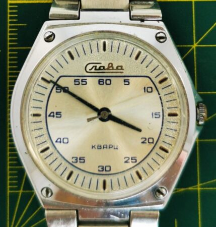 Petit fanion de tissus blanc verni imprimé de bleu clair, bleu foncé, jaune et rouge, illustré d’un dauphin, d’une montre, des mentions « слава» et «кварц» слава et du logo de la 2e Fabrique de Montre de Moscou. 11 x 21 cm. Avec un cordon blanc