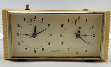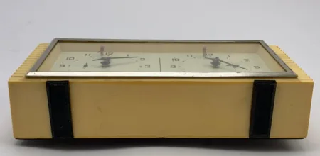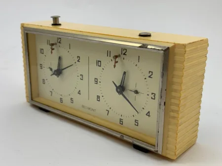La Fabrique d’Horloges d’Orel était devenue la productrice des horloges destinées aux joueurs d’échecs. Ce modèle, habituellement produit souset cela sous sa marque habituelle, Yantar (voir ici le modèle original).