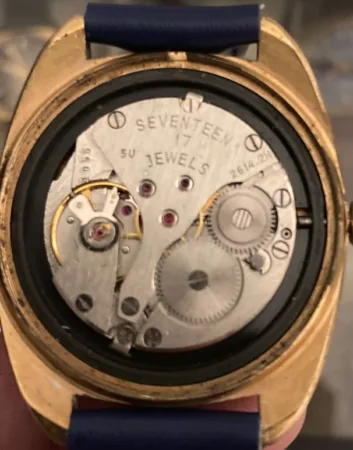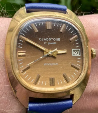 Montre-bracelet produite par la 1ère Fabrique de Montres de MoscouMarque d’exportation CladstoneBoîtier de laiton plaqué or type 4593Mécanisme : 2614.2HModèle des années ’80