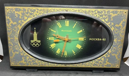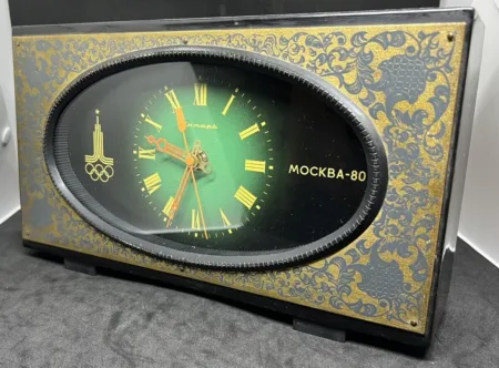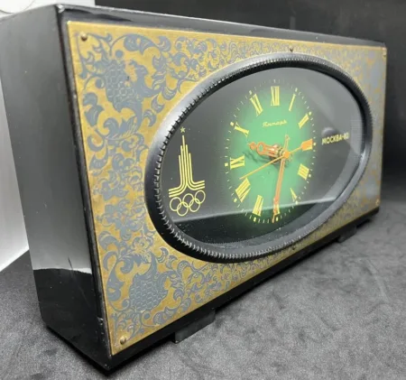 Horloge de table électro-mécanique de la Fabrique d’Horloges d’Orel célébrant les Jeux olympiques de Moscou de 1980 avec le logo des Jeux.