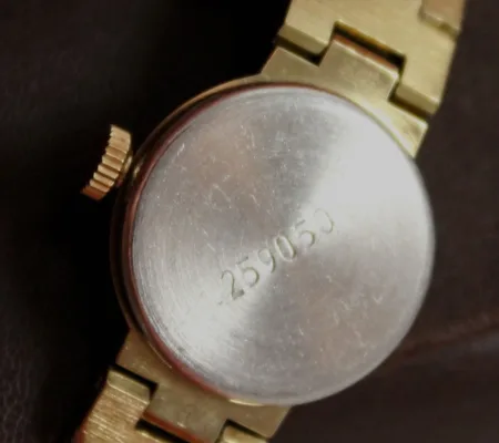 Mentions sur le calibre : 1601A sur un pont, SU (pour Soviet Union), dernier logo Tchaïka (T dans un écu) sur la platine
