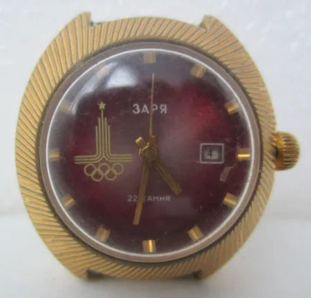 Montre bracelet mécanique à simple guichet pour dame de la Fabrique de montres de Penza célébrant les Jeux olympiques de Moscou de 1980 avec le logo des Jeux.