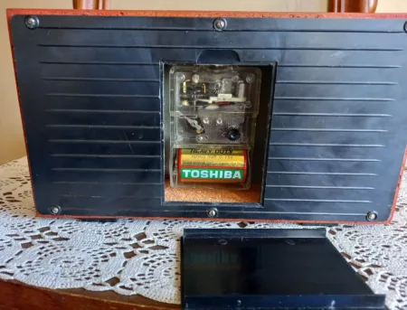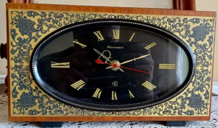 Horloge de table électro-mécanique de la Fabrique d’Horloges d’Orel Marque: Янтарны (Yantar, « ambre »)Mécanisme: 65591Largeur: 39 cmHauteur: 17 cmProfondeur: 7 cmProduction: Tout début des années ’80