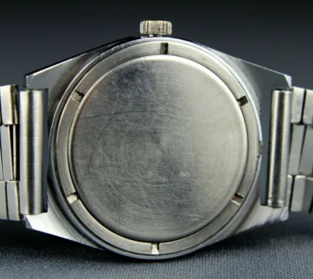 Bracelet métallique, soviétique, à boucle déployante marquée d’un нерж (inox) avec le logo en E d’Eletktronika.