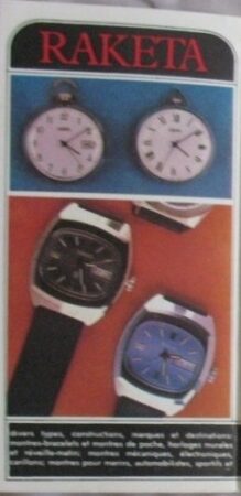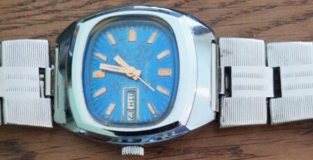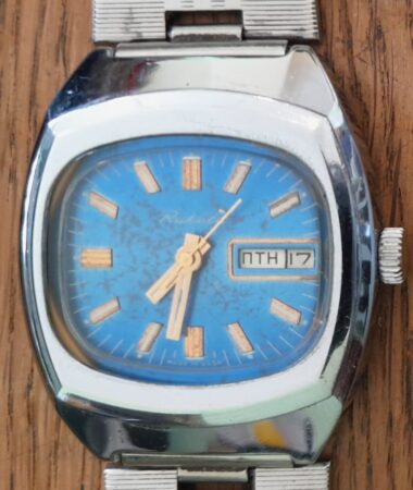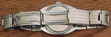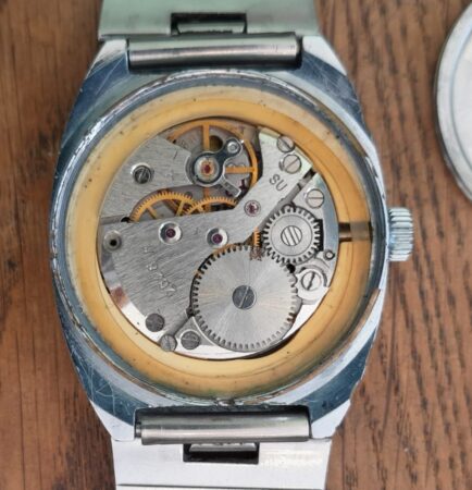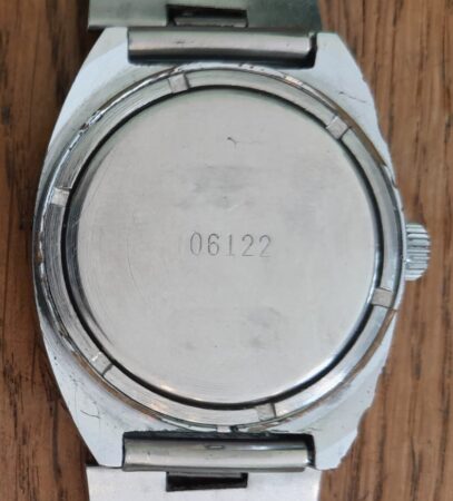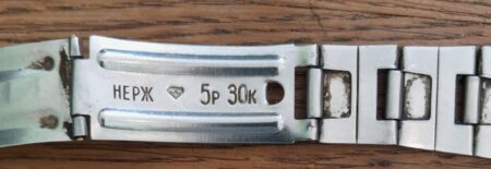 Avec un bracelet métallique, soviétique, aux maillons striés, marqué de la mention нерж (inox) et 5P30K, (5 roubles 30 kopecks) et du logo d’une fabrique non identifiée sur la boucle déployante.