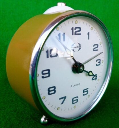 Réveil-matin pour l’exportation de la Fabrique d’Horloges d’Orel.Marque: KucoMécanisme: 6973 à 4 rubisProduit en 1978