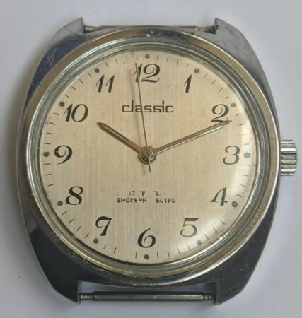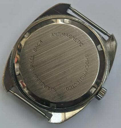 Cette montre a un boîtier, un cadran et des aiguilles qui ne sont pas issus de l’industrie horlogère soviétique. Ce sont des éléments vraisemblablement fabriqués à Hong Kong et la montre elle-même a probablement été produite à Hong-Kong à partir d’une mécanisme soviétique importé.