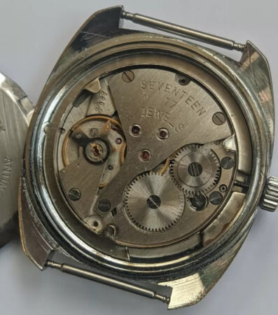 Autre mention sur le calibre : SEVENTEEN 18 JEWELS et SU sur un pont, n° de série sur la platine