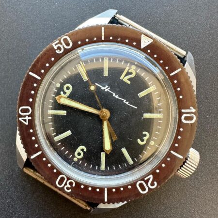 Il semble dater de 1964. C’est à ce moment que le Ministère de la défense soviétique cherchait une plongeuse pour ses forces armées, contrat finalement attribué à la par Fabrique de Montre de Tchistopol qui avait proposée l’Amphibia.