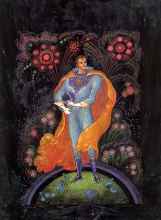 mais prenant parfois des sujets contemporains, parfois dans le style traditionnel comme pour ce portrait de Gagarine: