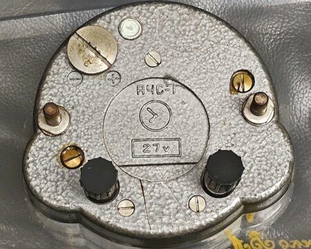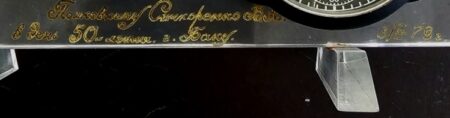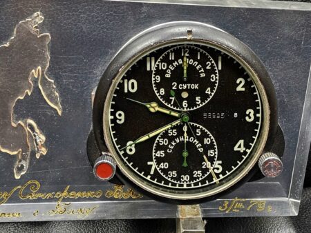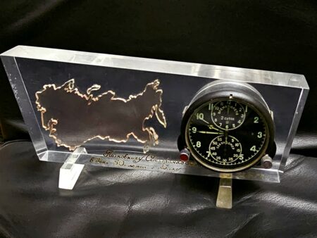 Sculpture de bureau comportant une horloge d’aviation АЧС-1 produit par la Fabrique de Montres de Tcheliabinsk montée sur un support en plexiglas avec la carte de l’URSS. Cadeau offert à un certain colonel Sichkorenko V.A. pour son 50e anniversaire – Bakou – 3 mars 1979.