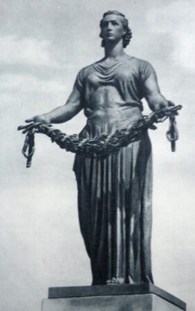 Statue de la mère patrie au mémorial du siège de Léningrad, avec mention « ДААЗ » (DAAZ) pour „Димитровградский автоагрегатный завод“, soit Fabrique d’équipements automobiles de Dimitrovgrad (dans la région d’Oulianovsk).