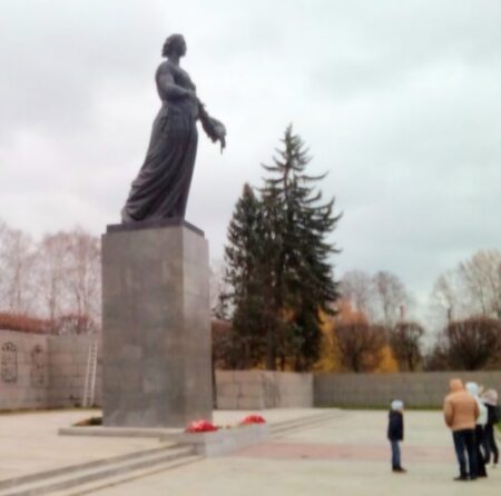 Environ 420 000 civils et 50 000 soldats du Front de Leningrad ont été enterrés dans 186 charniers. Près de l’entrée se trouve une flamme éternelle. Une plaque de marbre affirme que du 4 septembre 1941 au 22 janvier 1944 107 158 bombes aériennes ont été larguées sur la ville, 148 478 obus ont été tirés, 16 744 hommes sont morts, 33 782 blessés et 641 803 morts de faim. Au centre du Mémorial se trouve cette statue en bronze symbolisant la mère patrie.