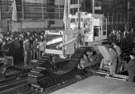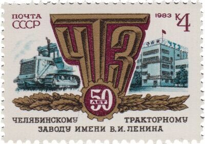 La mention « 50 лет ЧТЗ » célèbre les 50 ans de la Fabrique de Tracteurs de Tchéliabinsk ((Челябинский тракторный завод)