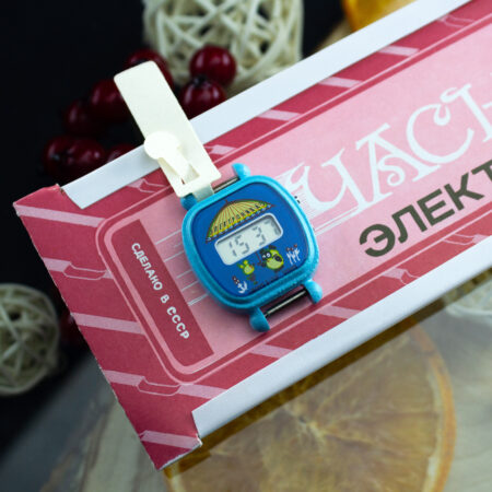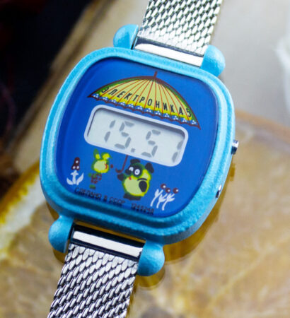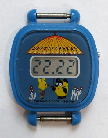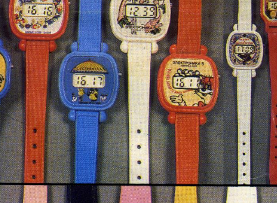 Montre bracelet à quartz et LCD (écran à cristaux liquides) pour enfant, produite par la Fabrique Elektronika du Combinat électronique « Integral », à Minsk.