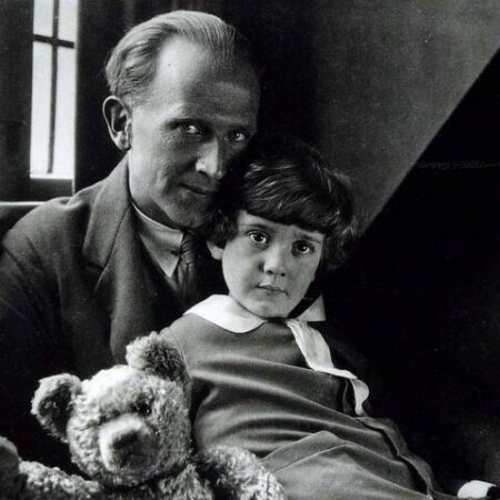 Christopher Robin Milne naquit à Londres en 1920. Il fréquenta le zoo de Londres, où il s’amusa avec Winnie. Comme il disposait d’un ours en peluche, nommé Edward, offert par ses parents, il inventa de petits récits, où se mêlaient la peluche et l’ourse du zoo. Alan Alexander Milne, son père, était au début des années vingt déjà connu pour plusieurs livres, dont un classique du roman policier « Le mystère de la maison rouge ». Inspiré par son fils, il écrivit en 1926 « Winnie the Pooh », illustré par Ernest Howard Shepard, et en 1928 « The House of Pooh Corner », illustré par le même artiste.