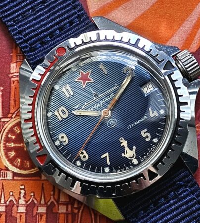 Mentions sur le calibre : 2414A, SU (Soviet Union), logo Vostok sur la platine.