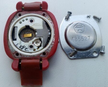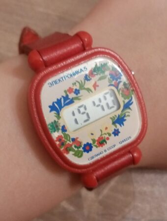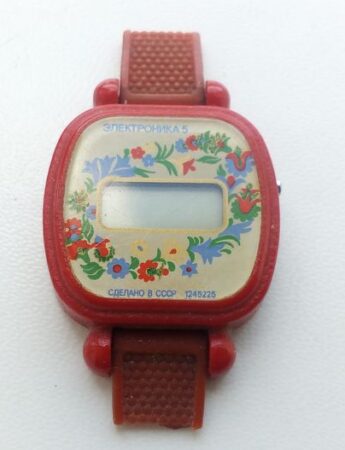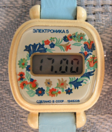 Montre bracelet à quartz et LCD (écran à cristaux liquides) pour enfant à motif floral, produite par la Fabrique Elektronika du Combinat électronique « Integral », à Minsk.