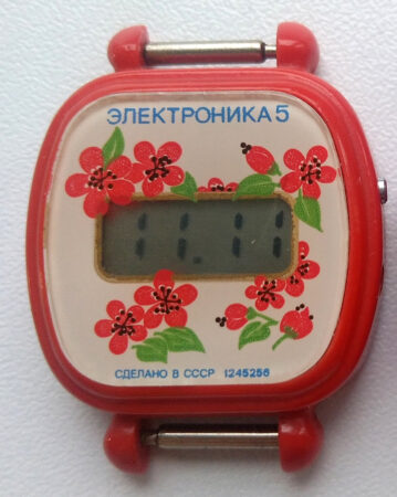 Montre bracelet à quartz et LCD (écran à cristaux liquides) pour enfant à motif floral, produite par la Fabrique Elektronika du Combinat électronique « Integral », à Minsk.