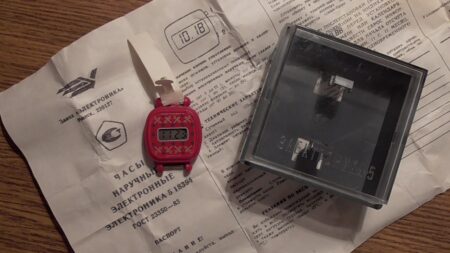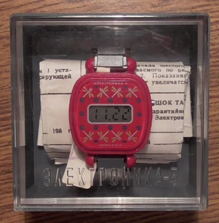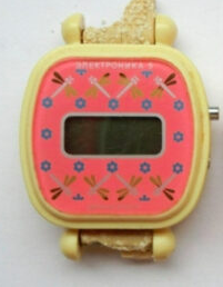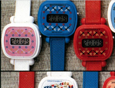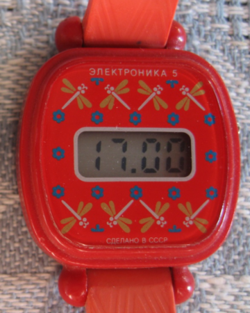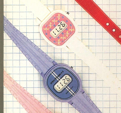 Montre bracelet à quartz et LCD (écran à cristaux liquides) pour enfant à motif de libellules, produite par la Fabrique Elektronika du Combinat électronique « Integral », à Minsk.