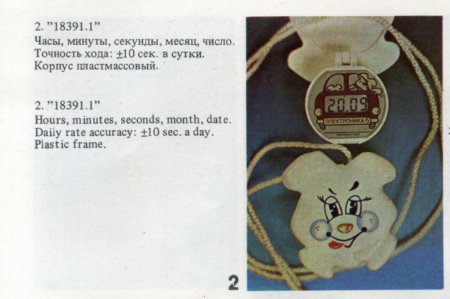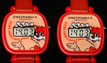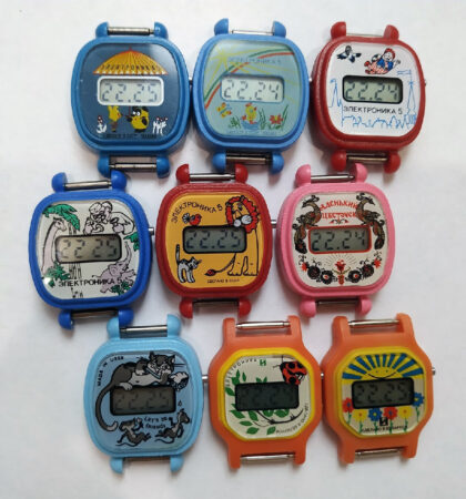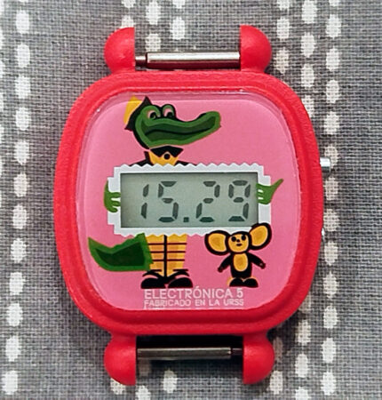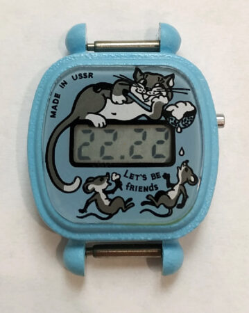 Aparraissent déjà quelques mpodèles classique, comme le « Soyouz« , le « Winnie l’ourson » (version soviétique bien sûr) et « Léopold le chat« , qui avait ce raffinement d’utiliser le clignotement de l’affichage de l’heure pour faire cligner de l’oeil à Léopold.