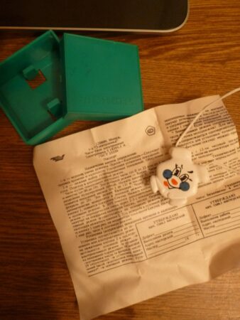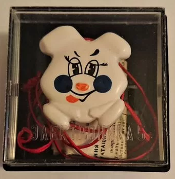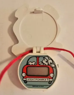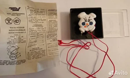 Montre bracelet à quartz et LCD (écran à cristaux liquides) pour enfant, dans un boitier pendentif figurant un chiot, produite par la Fabrique Elektronika du Combinat électronique « Integral », à Minsk.