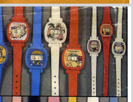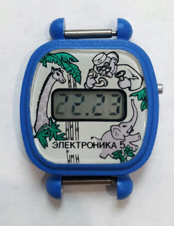 Montre bracelet à quartz et LCD (écran à cristaux liquides) pour enfant à motif de vétérinaire, éléphant, et girafe, produite par la Fabrique Elektronika du Combinat électronique « Integral », à Minsk.