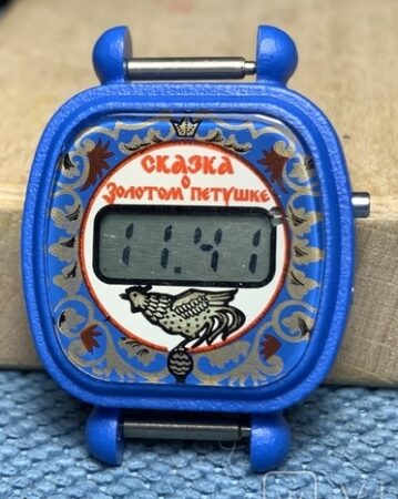 Montre bracelet à quartz et LCD (écran à cristaux liquides) pour enfant produite par la Fabrique Elektronika du Combinat électronique « Integral », à Minsk.