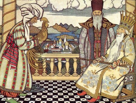 Le conte a été écrit en 1834 par Pouchkine. Il raconte l’histoire du roi Dadon Celui-ci avait été belliqueux dans sa jeunesse. Il voulait jouir d’un vieillesse paisible mais les guerres qu’il avait provoquées menaçaient le royaume dans toutes les directions. Désespéré, ne pouvant défendre toutes ses frontières à la fois, il fait appel à un mage qui lui offre un coq d’or. Placé sur le plus haut toit, il annoncera le danger et indiquera sa direction. Le mage demande roi en échage la satisfaction d’un souhait à venir. Après une période de paix, le coq alarmera trois fois le royaume, le roi envoie successivement deux armées commendées par ses fils, puis, resté sans nouvelle part lui-même à la tête de la troisième armé. Il y trouve ses fils morts à proximité d’une tente où une belle princesse qui lui fait oublier ses malheurs et ceux du royaume. La mage survient alors qui demande la princesse en payement. Le roi refuse et tue le mage. Le coq fond alors sur le roi et le tue d’un simple coup de bec. Et la princesse disparaîte comme si elle n’avait jamais existé.