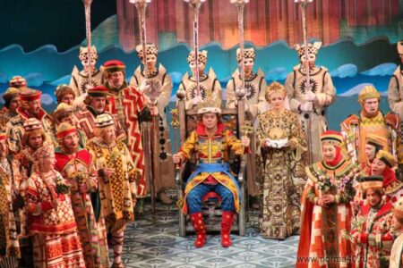 Le conte de Pouchkine a inspiré un opéra en trois actes de Nikolai Rimski-Korsakov dont le livret a été écrit par Vladimir I. Bielski. Composé en 1906-1907, l’opéra est une charge contre le tsatrisme. Le stupide et désastreux départ en guerre du roi Dodon évoquait clairement la guerre russo-japonaise de 1905. Rimski-Korsakov avait été démis de ses fonctions à la tête du conservatoire pour avoir soutenu les manoifestations de ses étudiants (Glazounov démissionna en solidarité). Ce fut le dernier opéra de Rimski-Korsakov. La censure l’interdit tout d’abord (il ne fut jamais représenté du vivant du compositeur) mais autorisa sa création le 7 octobre 1909 à Moscou au théâtre Solodovnikov, en exigeant d’importantes modificiations.